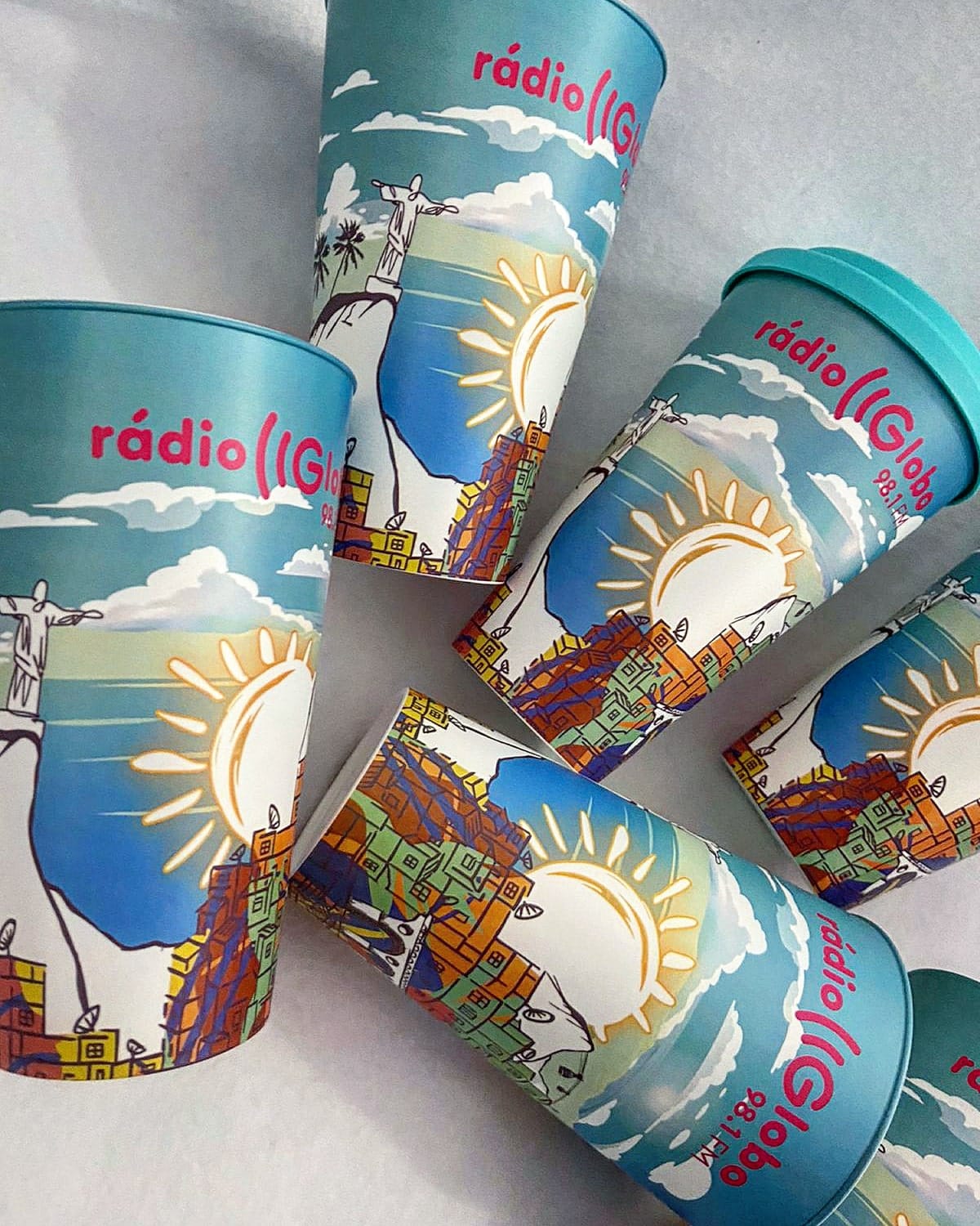 Design e Impressão: Formato cônico que permite a personalização em toda a volta do copo com cores vivas e alta fidelidade de detalhes.